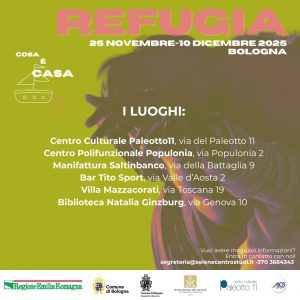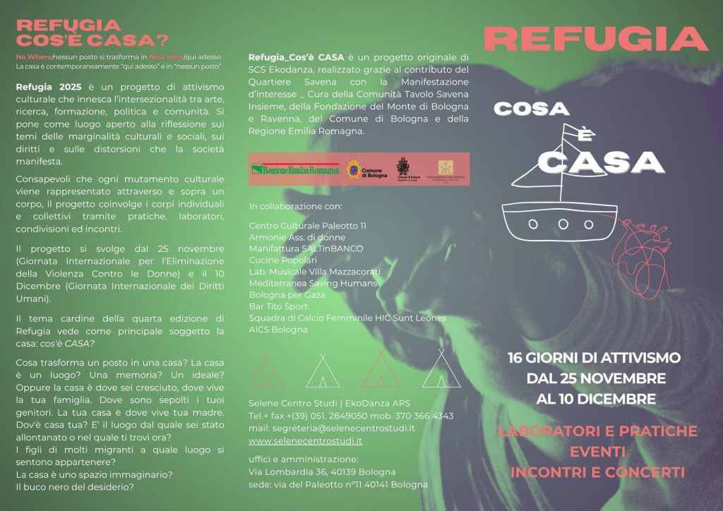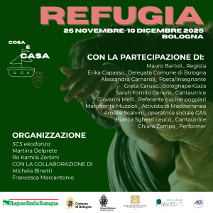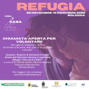 Refugia 2025 è un progetto di attivismo culturale tra arte, ricerca, formazione, attivismo, politica e comunità. Si pone come luogo aperto alla riflessione sui temi delle marginalità culturali e sociali, sui diritti e sulle distorsioni che la società manifesta. Consapevoli che ogni mutamento culturale viene rappresentato attraverso e sopra un corpo, il progetto coinvolge i corpi individuali e collettivi tramite pratiche, laboratori, condivisioni ed incontri. REFUGIA è uno spazio di ricerca artistica ma anche una proposta di attivismo culturale della durata di 16 giorni. Si manifesta in modo diffuso in Quartiere Savena nel periodo compreso tra il 25 Novembre (giornata internazionale per l’eliminazione della violenza contro le donne) e il 10 Dicembre (giornata internazionale dei Diritti Umani). Uno dei propositi è quello di creare un sistema integrato tra formazione, visione e ricerca artistica favorendo l’ascolto delle nuove generazioni e creando un calendario di appuntamenti a sostegno delle comunità. Il progetto stimola coesione e sensibilità ed è in grado di divenire uno strumento di integrazione delle differenze. Il tema cardine della quarta edizione di Refugia vede come principale soggetto la casa: cos’è CASA?