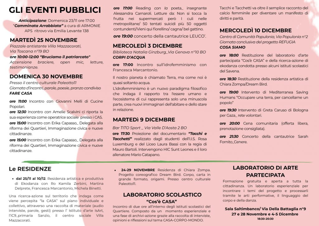 Il concetto CASA si intreccia tra le due giornate che aprono e concludono il progetto, rendendo dialettico e complesso: il farsi casa nel CORPO individuale (25 Novembre) e il farsi casa nel CORPO collettivo e comunitario (10 Dicembre).